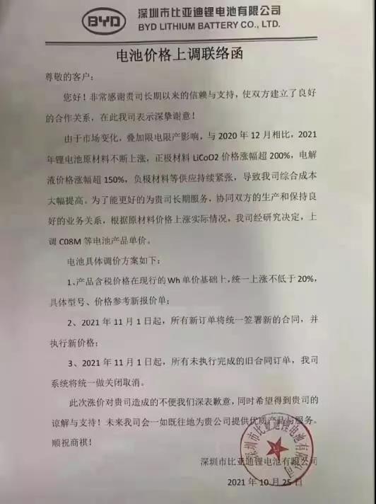 深圳市比亞迪鋰電池有限公司電池價(jià)格上調(diào)聯(lián)絡(luò)函尊敬的客戶:您好!非常感謝貴司長(zhǎng)期以來(lái)的信賴與支持,使雙方建立了良好的合作關(guān)系,在此我司表示深摯謝意!由于市場(chǎng)變化,疊加限電限產(chǎn)影響,與2020年12月相比,2021年鋰電池原材料不斷上漲,正極材料LiCoO2價(jià)格漲幅超200%,電解液價(jià)格漲幅超150%,負(fù)極材料等供應(yīng)持續(xù)緊張,導(dǎo)致我司綜合成本大幅提高。為了能更好的為貴司長(zhǎng)期服務(wù),協(xié)同雙方的生產(chǎn)和保持良好的業(yè)務(wù)關(guān)系,根據(jù)原材料價(jià)格上漲實(shí)際情況,我司經(jīng)研究決定,上調(diào)C08M等電池產(chǎn)品單價(jià)。電池具體調(diào)價(jià)方案如下:1、產(chǎn)品含稅價(jià)格在現(xiàn)行的Wh單價(jià)基礎(chǔ)上,統(tǒng)一上漲不低于20%,具體型號(hào)、價(jià)格參考新報(bào)價(jià)單:2、2021年11月1日起,所有新訂單將統(tǒng)一簽署新的合同,并執(zhí)行新價(jià)格;3、2021年11月1日起,所有未執(zhí)行完成的舊合同訂單,我司系統(tǒng)將統(tǒng)一做關(guān)閉取消。此次漲價(jià)對(duì)貴司造成的不便我們深表歉意,同時(shí)希望得到貴司的諒解與支持!未來(lái)我司會(huì)一如既往地為貴公司提供優(yōu)質(zhì)產(chǎn)品與服務(wù)。順祝商祺!深圳市比亞迪鋰電池有限公司2021年10月25日