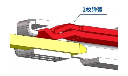 公端子采用2枚彈簧的結構。這比單片彈簧的接觸力高,有抑制來自外部振動影響的效果。