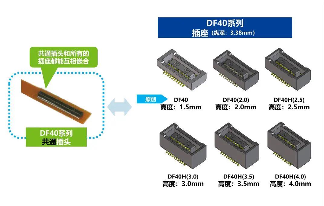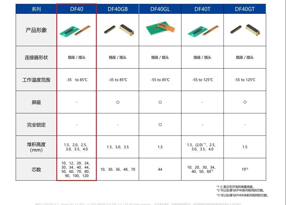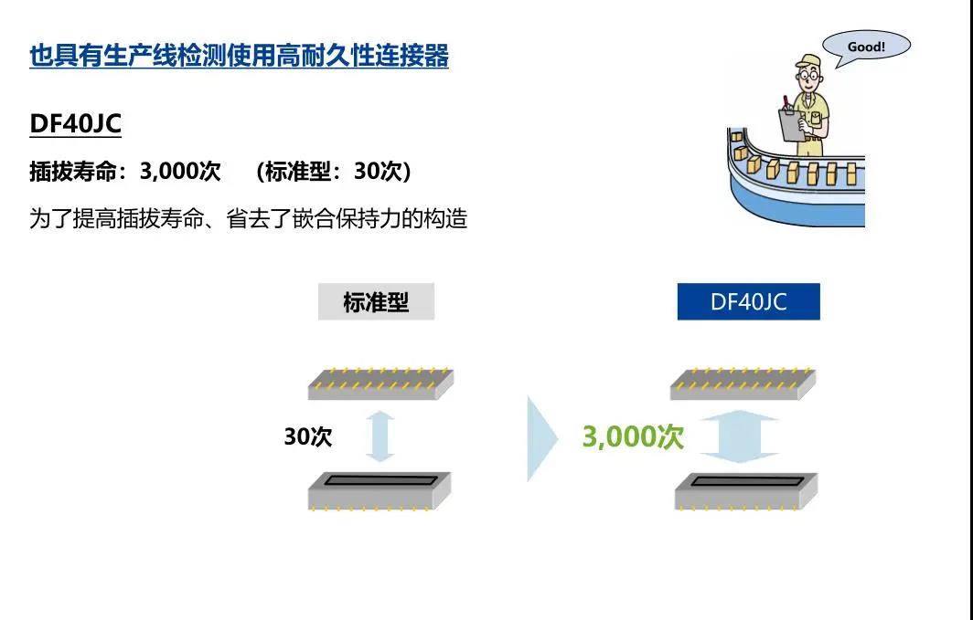 7. 種類繁多(帶護罩:DF40G系列,帶完全鎖:DF40GL系列,ADAS:DF40T系列) 8.核心數(shù)量從10到120核心變化巨大 9.用導向肋確保自動對準:0.33mm 10.防止鎳阻擋層焊接的結(jié)構 11.還提供用于生產(chǎn)線檢查的高度耐用的連接器* 只有H=1.5 mm的產(chǎn)品支持Type-C
