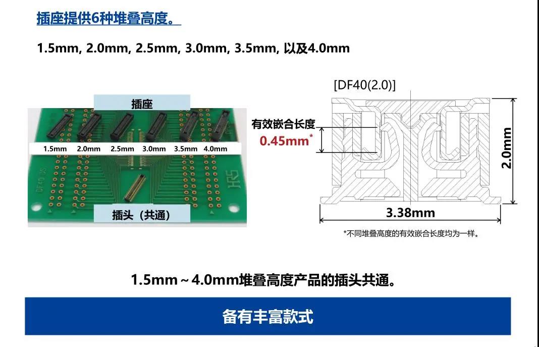 特點 1. 省空間:縱深3.38mm 2. 堆疊高度 1.5-4.0mm 3. 對應USB4 Gen.2(10Gbps)信號傳輸 *1 4. 有效嵌合長度長:0.45mm 5. 卓越的端子構造實現(xiàn)了明確的鎖扣手感以及大嵌合力 6. 防止端子變形構造 7. 種類繁多(帶護罩:DF40G系列,帶完全鎖:DF40GL系列,ADAS:DF40T系列) 8.核心數(shù)量從10到120核心變化巨大 9.用導向肋確保自動對準:0.33mm 10.防止鎳阻擋層焊接的結(jié)構 11.還提供用于生產(chǎn)線檢查的高度耐用的連接器* 只有H=1.5 mm的產(chǎn)品支持Type-C DF40系列變體